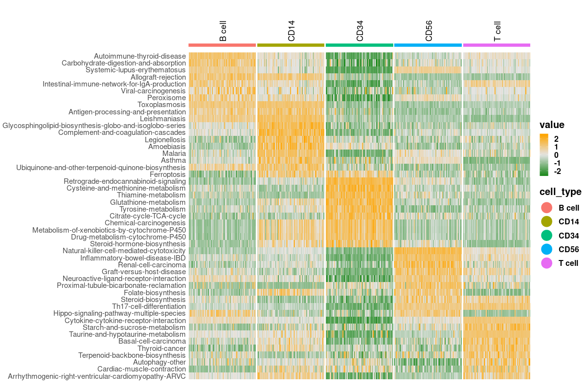 In this panel, users can obtain the pathway activation distribution of the selected pathway signature in a certain cell type. In addition, the heatmap shows the gene expression of the specified pathway in a certain cell type.